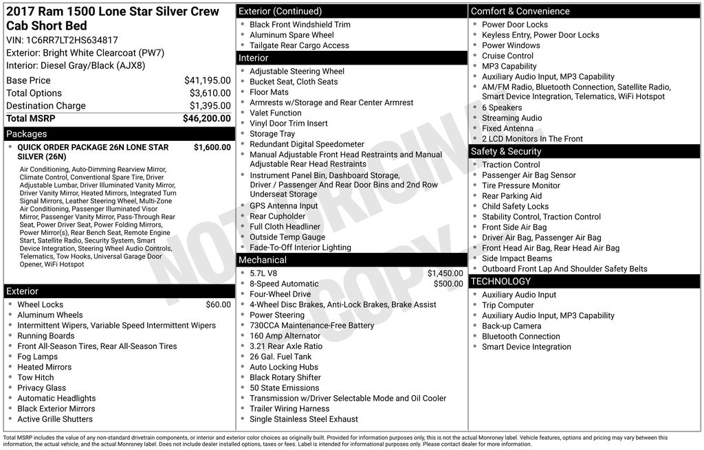 2017 Ram 1500 Lone Star Silver Bright White Clearcoat Lone Star Silver 4WD 8-Speed Automatic HEMI 5.7L V8 Multi Displacement VVT 115V Auxiliary Power Outlet, 17" x 7" Aluminum Wheels, 3.21 Rear Axle Ratio, 4-Wheel Disc Brakes, 40/20/40 Split Bench Seat, 6 Month Trial (Reg. Required), 6 Month Trial (Registration Required), 6 Speakers, 8.4" Touchscreen Display, ABS brakes, Active Grille Shutters, Air Conditioning, Air Conditioning ATC w/Dual Zone Control, Alloy wheels, AM/FM radio, Audio Jack Input for Mobile Devices, Auto-Dimming Exterior Mirrors, Auto-Dimming Rear-View Mirror, Black Exterior Mirrors, Black Rotary Shifter, Brake assist, Bright Grille, Bucket Seats, Bumpers: chrome, Center Hub, Charge Only Remote USB Port, Chrome Belt Moldings, Chrome Exterior Mirrors, Class IV Receiver Hitch, Cloth 40/20/40 Bench Seat, Cloth Bucket Seats, Compass, Delay-off headlights, Driver door bin, Dual front impact airbags, Dual front side impact airbags, Dual Rear Exhaust w/Bright Tips, Electric Shift-On-Demand Transfer Case, Electroluminescent Instrument Cluster, Electronic Shift, Electronic Stability Control, Exterior Mirrors Courtesy Lamps, Exterior Mirrors w/Heating Element, Exterior Mirrors w/Supplemental Signals, Fog Lamps, Folding Flat Load Floor Storage, For Details Visit DriveUconnect.com, Front anti-roll bar, Front Armrest w/3 Cupholders, Front Center Armrest w/Storage, Front reading lights, Front wheel independent suspension, Full Length Upgraded Floor Console, Fully automatic headlights, Glove Box Lamp, GPS Antenna Input, Heated door mirrors, High Back Seats, Humidity Sensor, Illuminated entry, Integrated Voice Command w/Bluetooth, Leather Wrapped Steering Wheel, LED Bed Lighting, Lone Star Badge, Lone Star Silver Edition, Low tire pressure warning, Media Hub (USB, AUX), Nav-Capable! See Dealer for Details, Occupant sensing airbag, Outside temperature display, Overhead airbag, Overhead console, Overhead Console w/Garage Door Opener, Panic alarm, ParkSense Front/Rear Park Assist System, ParkView Rear Back-Up Camera, Passenger door bin, Passenger vanity mirror, Power 10-Way Driver Seat, Power door mirrors, Power Lumbar Adjust, Power Multi-Function F/Away Mirrors, Power steering, Power windows, Power-Folding Mirrors, Quick Order Package 26N Lone Star Silver (Regional), Radio data system, Radio: Uconnect 3 w/5" Display, Radio: Uconnect 3C w/8.4" Display, Rear 60/40 Split Folding Seat, Rear anti-roll bar, Rear Dome w/On/Off Switch Lamp, Rear seat center armrest, Rear step bumper, Remote keyless entry, Remote Start System, Remote USB Port, Security Alarm, SIRIUSXM Satellite Radio, Speed control, Steering Wheel Mounted Audio Controls, Storage Tray, Sun Visors w/Illuminated Vanity Mirrors, Tachometer, Tilt steering wheel, Tip Start, Tow Hooks, Traction control, Trip computer, Uconnect Access, Underhood Lamp, Universal Garage Door Opener, Variably intermittent wipers, Voltmeter, Wheel to Wheel Side Steps, Wheels: 20" x 9" Polished Aluminum Forged.