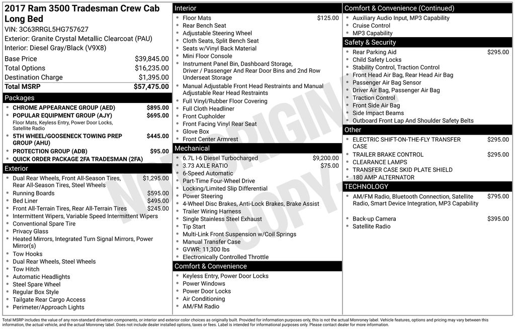 2017 Ram 3500 Tradesman Granite Crystal Metallic Clearcoat Tradesman 4WD 6-Speed Automatic Cummins 6.7L I6 Turbodiesel 1-Year SiriusXM Radio Service, 180 Amp Alternator, 3.73 Axle Ratio, 4-Wheel Disc Brakes, 40/20/40 Split Bench Seat, 5-Year Trial Via Mobile Service, 5.0" Touchscreen Display, 5th Wheel/Gooseneck Towing Prep Group, 6 Speakers, 6000# Front Axle w/Hub Ext, ABS brakes, Air Conditioning, AM/FM radio, Box & Rear Fender Clearance Lamps, Brake assist, Bright Front Bumper, Bright Grille, Bright Rear Bumper, Carpet Floor Covering, Chrome Appearance Group, Chrome Tubular Side Steps, Clearance Lamps, Cloth 40/20/40 Bench Seat, Delay-off headlights, Driver door bin, Dual front impact airbags, Dual front side impact airbags, Dual Rear Wheels, Electric Shift-On-The-Fly Transfer Case, Electronic Stability Control, Electronically Controlled Throttle, For Details Visit DriveUconnect.com, For More Info, Call 800-643-2112, Front & Rear Floor Mats, Front & Rear Rubber Floor Mats, Front anti-roll bar, Front Armrest w/Cupholders, Front Bumper Sight Shields, Front Center Armrest, Fully automatic headlights, GPS Antenna Input, HD Vinyl 40/20/40 Split Bench Seat, Heated door mirrors, Integrated Voice Command w/Bluetooth, Low tire pressure warning, Media Hub (USB, AUX), Mini Floor Console, Occupant sensing airbag, Overhead airbag, Overhead Console, ParkSense Rear Park Assist System, ParkView Rear Back-Up Camera, Passenger door bin, Popular Equipment Group, Power door mirrors, Power steering, Power windows, Protection Group, Quick Order Package 2FA Tradesman, Radio data system, Radio: 3.0, Radio: Uconnect 3 w/5" Display, Rear Folding Seat, Rear step bumper, Remote Keyless Entry, Remote USB Port - Charge Only, SiriusXM Satellite Radio, Speed control, Spray In Bedliner, Storage Tray, Tachometer, Temperature & Compass Gauge, Tilt steering wheel, Tip Start, Tire Pressure Monitoring Delete, Traction control, Trailer Brake Control, Turn signal indicator mirrors, Uconnect Access Via Mobile, Variably intermittent wipers, Voltmeter, Wheels: 17" x 6.0" Steel Argent, Wheels: 17" x 6.0" Steel Chrome Clad, Wheels: 18" x 8.0" Steel.