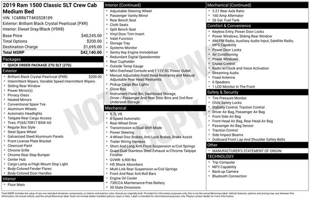 The 2019 Ram 1500 Classic SLT 4x4 delivers dependable V8 power, practical comfort, and classic pickup toughness â" all at a value that makes sense. With a strong engine, solid utility, and dependable reliability, this Ram Classic is perfect for daily work, weekend projects, or everyday driving.