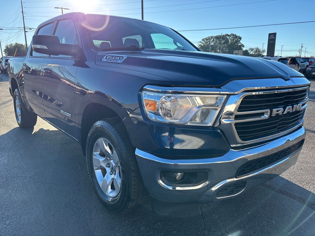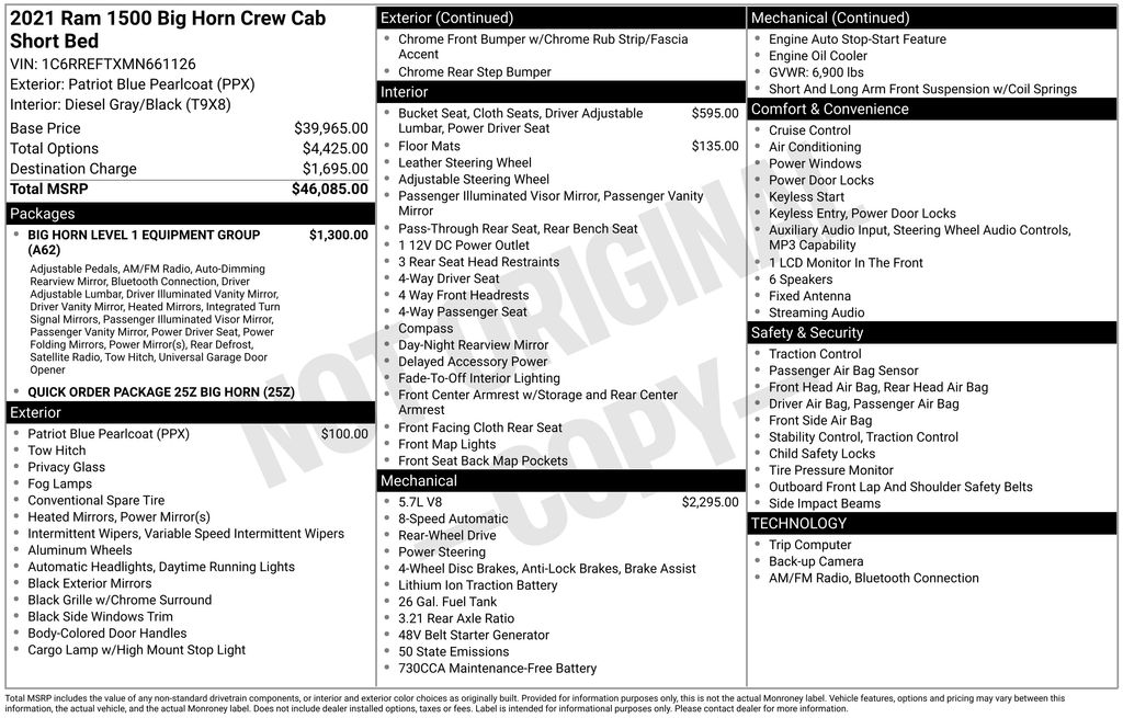 2021 Ram 1500 Big Horn/Lone Star Patriot Blue Pearlcoat Big Horn/Lone Star RWD 8-Speed Automatic HEMI 5.7L V8 Multi Displacement VVT 2nd Row In Floor Storage Bins, 3 Rear Seat Head Restraints, 3.21 Rear Axle Ratio, 4 Way Front Headrests, 4-Wheel Disc Brakes, 40/20/40 Split Bench Seat, 48V Belt Starter Generator, 6 Speakers, ABS brakes, Air Conditioning, Alloy wheels, AM/FM radio, Auto-Dimming Exterior Driver Mirror, Auto-Dimming Rear-View Mirror, Big Horn Badge, Big Horn Level 1 Equipment Group, Black Exterior Mirrors, Black Premium Power Mirrors, Brake assist, Bumpers: chrome, Class IV Receiver Hitch, Cloth Bench Seat, Cluster 3.5" TFT Color Display, Compass, Delay-off headlights, Driver door bin, Dual front impact airbags, Dual front side impact airbags, Electronic Stability Control, Exterior Mirrors Courtesy Lamps, Exterior Mirrors w/Supplemental Signals, Foam Bottle Insert (Door Trim Panel), For More Info, Call 800-643-2112, Front anti-roll bar, Front Center Armrest w/Storage, Front fog lights, Front reading lights, Front Seat Back Map Pockets, Front wheel independent suspension, Fully automatic headlights, Glove Box Lamp, GPS Antenna Input, Heated door mirrors, Illuminated entry, Integrated Voice Command w/Bluetooth, Leather steering wheel, Low tire pressure warning, MOPAR Front & Rear Rubber Floor Mats, Occupant sensing airbag, Outside temperature display, Overhead airbag, Overhead console, Panic alarm, ParkView Rear Back-Up Camera, Passenger door bin, Passenger vanity mirror, Power 4-Way Driver Lumbar Adjust, Power 8-Way Driver Seat, Power Adjustable Pedals, Power door mirrors, Power steering, Power windows, Power-Folding Mirrors, Quick Order Package 25Z Big Horn (DISC), Radio data system, Radio: Uconnect 3 w/5" Display, Radio: Uconnect 4 w/8.4" Display, Rear 60/40 Folding Seat, Rear anti-roll bar, Rear Dome w/On/Off Switch Lamp, Rear Power Sliding Window, Rear seat center armrest, Rear step bumper, Rear Window Defroster, Remote keyless entry, SiriusXM Radio Service, SiriusXM Satellite Radio, Speed control, Split folding rear seat, Steering wheel mounted audio controls, Sun Visors w/Illuminated Vanity Mirrors, Tachometer, Telescoping steering wheel, Tilt steering wheel, Traction control, Trip computer, Universal Garage Door Opener, Variably intermittent wipers, Voltmeter, Wheels: 18" x 8" Cast-Aluminum Painted.