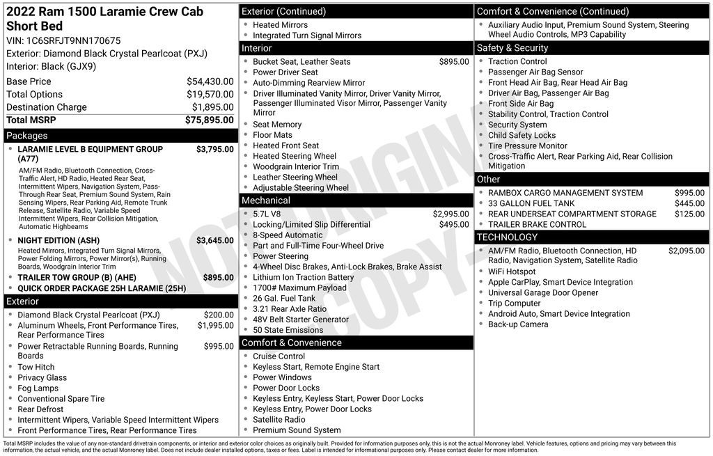 2022 Ram 1500 Laramie Diamond Black Crystal Pearlcoat Laramie 4WD 8-Speed Automatic HEMI 5.7L V8 Multi Displacement VVT #1 Seat Foam Cushion, 10 Speakers, 12" Touchscreen Display, 2nd Row In Floor Storage Bins, 3 Rear Seat Head Restraints, 3.21 Rear Axle Ratio, 33 Gallon Fuel Tank, 4 Way Front Headrests, 4-Wheel Disc Brakes, 48V Belt Starter Generator, 4G LTE Wi-Fi Hot Spot, 8.4" Touchscreen Display, ABS brakes, Accent Color Premium Power Mirrors, Adjustable pedals, Air Conditioning, All R1 High Radios, All Radio Equipped Vehicles, Alloy wheels, AM/FM radio: SiriusXM, Anti-Spin Differential Rear Axle, Apple CarPlay, Apple CarPlay/Android Auto, Audio memory, Auto High Beam Headlamp Control, Auto-dimming door mirrors, Auto-Dimming Exterior Driver Mirror, Auto-dimming Rear-View mirror, Automatic temperature control, Black Exterior Truck Badging, Black Headlamp Bezels, Black Interior Accents, Black Painted Exterior Mirrors Caps, Body Color Door Handles, Body Color Front Bumper, Body Color Rear Bumper w/Step Pads, Brake assist, Bucket Seats, Bumpers: chrome, Chrome Exterior Mirrors, Compass, Connected Travel & Traffic Services, Connectivity - US/Canada, Convex Wide-Angle Mirror Insert, Delay-off headlights, Delete LED Lamp - Floor Console Bin, Disassociated Touchscreen Display, Driver door bin, Driver Seat Memory, Driver vanity mirror, Dual Exhaust w/Black Tips, Dual front impact airbags, Dual front side impact airbags, Electronic Stability Control, Exterior 115V AC Outlet, Exterior Mirrors Courtesy Lamps, Exterior Mirrors w/Heating Element, Exterior Mirrors w/Memory, Exterior Mirrors w/Supplemental Signals, Foam Bottle Insert (Door Trim Panel), For Details, Visit DriveUconnect.com, For More Info, Call 800-643-2112, Front anti-roll bar, Front Center Armrest w/Storage, Front dual zone A/C, Front fog lights, Front reading lights, Front Seat Back Map Pockets, Front wheel independent suspension, Full Length Upgraded Floor Console, Fully automatic headlights, Garage door transmitter, Global Telematics Box Module (TBM), Google Android Auto, GPS Antenna Input, GPS Navigation, Grille Surround 3 Black Texture 2 Black, HD Radio, Heated door mirrors, Heated Front Seats, Heated front seats, Heated Second Row Seats, Heated Steering Wheel, Heated steering wheel, Heavy-Duty Engine Cooling, Illuminated entry, Integrated Center Stack Radio, Integrated Voice Command w/Bluetooth, Laramie Level B Equipment Group (DISC), Leather steering wheel, Leather Trim 40/20/40 Bench Seat, Leather Trimmed Bucket Seats, Low tire pressure warning, Memory seat, Mopar Black Tubular Side Steps, Night Edition, Occupant sensing airbag, Outside temperature display, Overhead airbag, Overhead console, Panic alarm, ParkSense Front/Rear Park Assist w/Stop, ParkView Rear Back-Up Camera, Passenger door bin, Passenger vanity mirror, Pedal memory, Power 2-Way Driver Lumbar Adjust, Power 2-Way Passenger Lumbar Adjust, Power 8-Way Driver & Passenger Seats, Power door mirrors, Power driver seat, Power passenger seat, Power Running Boards, Power steering, Power windows, Power-Folding Mirrors, Quick Order Package 25H Laramie, Radio data system, Radio: Uconnect 5 Nav w/12.0" Display, Radio: Uconnect 5 Nav w/8.4" Display, Radio: Uconnect 5 W w/8.4" Display, Rain Sensitive Windshield Wipers, RamBox Cargo Management System, Rear 60/40 Folding Seat, Rear 60/40 Folding Split Recline Seat, Rear anti-roll bar, Rear seat center armrest, Rear step bumper, Rear Underseat Compartment Storage (DISC), Rear window defroster, Remote keyless entry, Remote Tailgate Release, Security system, SiriusXM Radio Service, SiriusXM w/360L, Speed control, Split folding rear seat, Sport Performance Hood, Steering wheel mounted audio controls, Tachometer, Telescoping steering wheel, Tilt steering wheel, Traction control, Trailer Brake Control, Trailer Light Check, Trailer Tow Group (B) (DISC), Trip computer, Turn signal indicator mirrors, Twill Film Appliques, USB Host Flip, Variably intermittent wipers, Ventilate