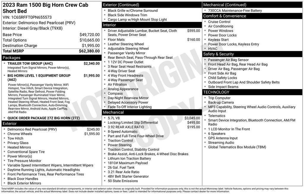 2023 Ram 1500 Big Horn/Lone Star Delmonico Red Pearlcoat Big Horn/Lone Star 4WD 8-Speed Automatic HEMI 5.7L V8 Multi Displacement VVT eTorque 2nd Row In Floor Storage Bins, 3 Rear Seat Head Restraints, 4 Way Front Headrests, 4-Wheel Disc Brakes, 48V Belt Starter Generator, 4G LTE Wi-Fi Hot Spot, 6 Speakers, 8.4" Touchscreen Display, ABS brakes, Air Conditioning, Alloy wheels, AM/FM radio, Anti-Spin Differential Rear Axle, Apple CarPlay, Auto-Dimming Exterior Driver Mirror, Auto-Dimming Rear-View Mirror, Big Horn Badge, Big Horn Level 1 Equipment Group, Black Exterior Mirrors, Black Premium Power Mirrors, Black Trailer Tow Power Mirrors (DISC), Bluetooth Handsfree Phone & Audio, Brake assist, Bumpers: chrome, Class IV Receiver Hitch, Cloth Bench Seat, Compass, Connectivity - US/Canada, Convex Wide-Angle Exterior Mirror Insert, Delay-off headlights, Driver door bin, Dual front impact airbags, Dual front side impact airbags, Electric Shift-On-Demand Transfer Case, Electronic Stability Control, Emergency communication system: SiriusXM Guardian, Exterior Mirrors Courtesy Lamps, Exterior Mirrors w/Heating Element, Exterior Mirrors w/Supplemental Signals, For Details, Visit DriveUconnect.com, For More Info, Call 800-643-2112, Front anti-roll bar, Front Center Armrest w/Storage, Front Fog Lamps, Front License Plate Bracket, Front reading lights, Front Seat Back Map Pockets, Front wheel independent suspension, Fully automatic headlights, Global Telematics Box Module (TBM), Glove Box Lamp, Google Android Auto, GPS Antenna Input, Heated door mirrors, Heated Front Seats, Heated Steering Wheel, Illuminated entry, Integrated Center Stack Radio, Integrated Voice Command w/Bluetooth, Leather steering wheel, Low tire pressure warning, MOPAR Front & Rear Rubber Floor Mats, Occupant sensing airbag, Outside temperature display, Overhead airbag, Overhead console, Panic alarm, ParkView Rear Back-Up Camera, Passenger door bin, Passenger Sun Visor w/Illuminated Mirror, Passenger vanity mirror, Power door mirrors, Power steering, Power windows, Power-Folding Mirrors, Quick Order Package 27Z Big Horn, Radio data system, Radio: Uconnect 3 w/5" Display, Radio: Uconnect 5 W w/8.4" Display, RAM Grille Badge - Chrome, Rear 60/40 Folding Seat, Rear anti-roll bar, Rear Dome w/On/Off Switch Lamp, Rear Power Sliding Window, Rear seat center armrest, Rear step bumper, Rear Window Defroster, Remote keyless entry, Remote Start System, SiriusXM Satellite Radio, Speed control, Split folding rear seat, Steering wheel mounted audio controls, Tachometer, Telescoping steering wheel, Tilt steering wheel, Traction control, Trailer Brake Control, Trailer Light Check, Trailer Reverse Steering Control, Trailer Tire Pressure Monitoring System, Trailer Tow Group, Trailer Tow Mirrors, Trip computer, USB Host Flip, Variably intermittent wipers, Voltmeter, Wheels: 18" x 8" Cast-Aluminum Painted, Wheels: 20" x 9" Aluminum Chrome Clad.