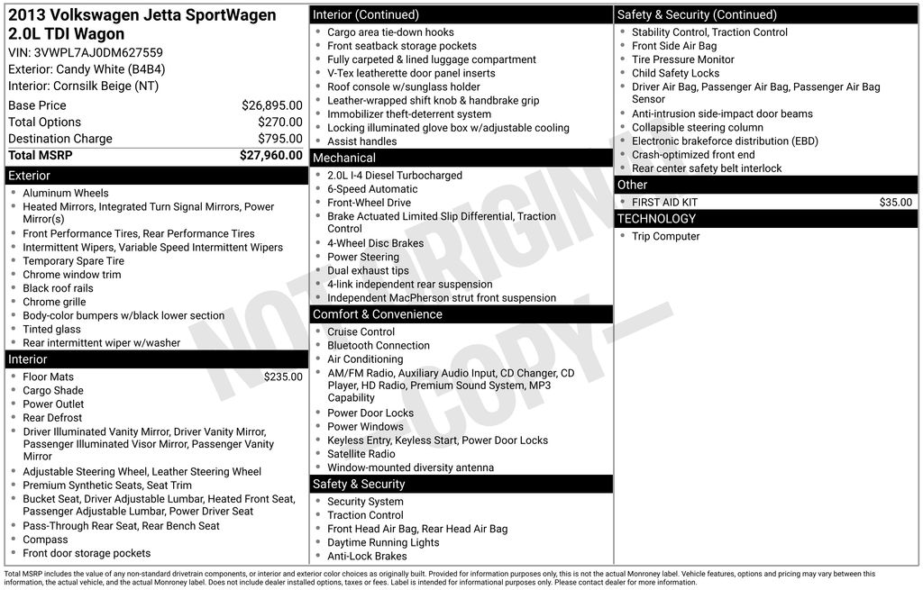 2013 Volkswagen Jetta SportWagen 2.0L TDI White 2.0L TDI FWD 6-Speed Automatic DSG 2.0L TDI Diesel Turbocharged 10 Speakers, 4-Wheel Disc Brakes, ABS brakes, Air Conditioning, Alloy wheels, AM/FM radio: SiriusXM, Anti-whiplash front head restraints, Brake assist, Bumpers: body-color, CD player, Compass, Driver door bin, Driver vanity mirror, Dual front impact airbags, Dual front side impact airbags, Electronic Stability Control, Four wheel independent suspension, Front anti-roll bar, Front Bucket Seats, Front Center Armrest, Front reading lights, Heatable Front Comfort Seats, Heated door mirrors, Heated front seats, Illuminated entry, Leather Shift Knob, Leather steering wheel, Low tire pressure warning, MP3 decoder, Occupant sensing airbag, Outside temperature display, Overhead airbag, Overhead console, Panic alarm, Passenger door bin, Passenger vanity mirror, Power door mirrors, Power driver seat, Power passenger seat, Power steering, Power windows, Radio data system, Rear anti-roll bar, Rear seat center armrest, Rear window defroster, Rear window wiper, Remote keyless entry, Roof rack: rails only, Security system, Speed control, Speed-sensing steering, Split folding rear seat, Steering wheel mounted audio controls, Tachometer, Telescoping steering wheel, Tilt steering wheel, Traction control, Trip computer, Turn signal indicator mirrors, V-Tex Leatherette Seat Trim, Variably intermittent wipers.