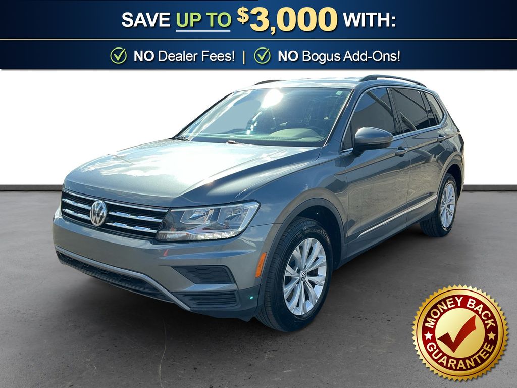 2018 Volkswagen Tiguan 2.0T SE Platinum Gray Metallic 2.0T SE FWD 8-Speed Automatic with Tiptronic 2.0L TSI DOHC 3.33 Axle Ratio, 3rd row seats: bench, 4-Wheel Disc Brakes, 6 Speakers, ABS brakes, Air Conditioning, Alloy wheels, AM/FM radio: SiriusXM, Automatic temperature control, Brake assist, Bumpers: body-color, Compass, Delay-off headlights, Driver door bin, Driver vanity mirror, Dual front impact airbags, Dual front side impact airbags, Electronic Stability Control, Emergency communication system: VW Car-Net, Exterior Parking Camera Rear, Four wheel independent suspension, Front anti-roll bar, Front Bucket Seats, Front Center Armrest, Front dual zone A/C, Front reading lights, Fully automatic headlights, Heated door mirrors, Heated Front Bucket Seats, Heated front seats, Illuminated entry, Leather Shift Knob, Low tire pressure warning, Occupant sensing airbag, Outside temperature display, Overhead airbag, Overhead console, Panic alarm, Passenger door bin, Passenger vanity mirror, Perforated V-Tex Leatherette Seating Surfaces, Power door mirrors, Power driver seat, Power steering, Power windows, Radio data system, Radio: AM/FM/HD/CD w/Dual USB & Aux-In, Rear anti-roll bar, Rear reading lights, Rear seat center armrest, Rear window defroster, Rear window wiper, Remote CD player, Remote keyless entry, Roof rack: rails only, Speed control, Speed-sensing steering, Split folding rear seat, Spoiler, Steering wheel mounted audio controls, Tachometer, Telescoping steering wheel, Tilt steering wheel, Traction control, Trip computer, Turn signal indicator mirrors, Variably intermittent wipers, Wheels: 17" Tulsa.