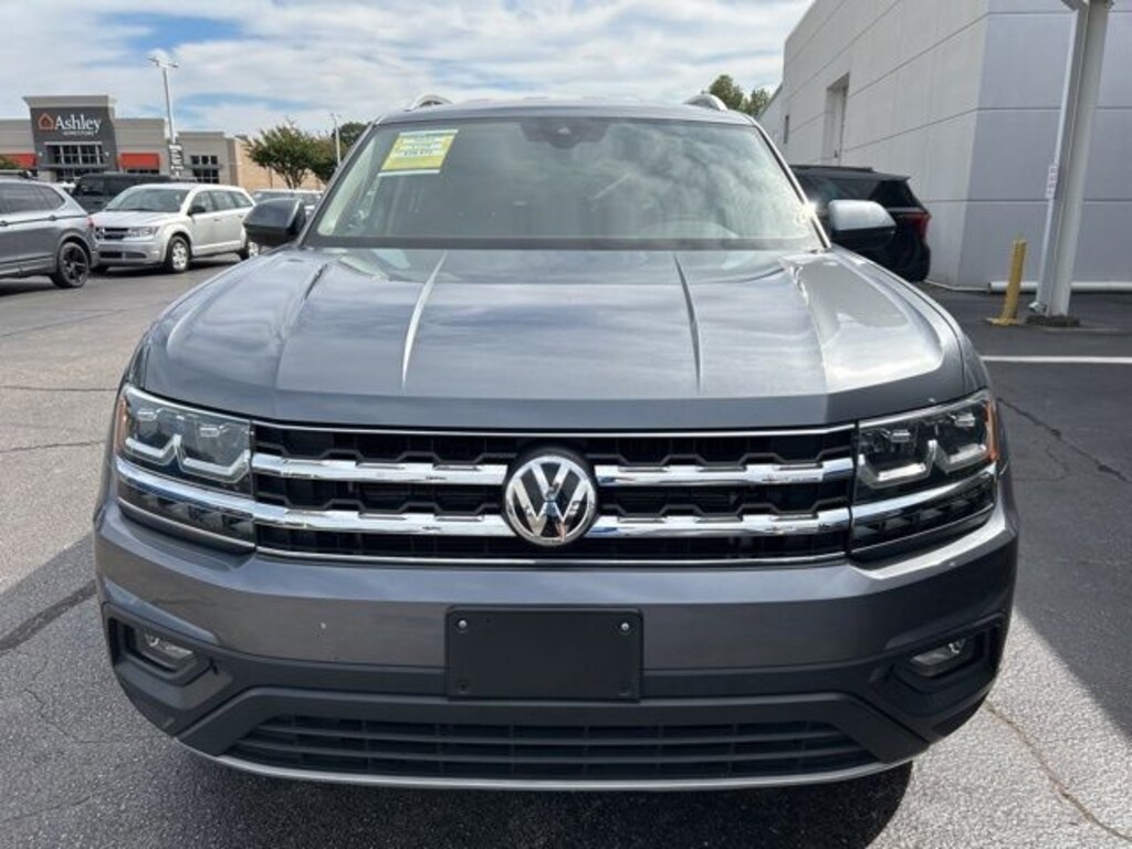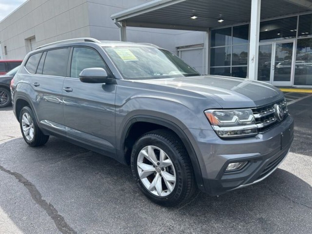 2019 Volkswagen Atlas 3.6L V6 SE w/Technology Platinum Gray Metallic 3.6L V6 SE w/Technology FWD 8-Speed Automatic with Tiptronic 3.6L VR6 18" 5-Spoke Wheels, 3.60 Axle Ratio, 3rd row seats: split-bench, 4-Wheel Disc Brakes, 8 Speakers, ABS brakes, Active Blind Spot Monitor, Air Conditioning, Alloy wheels, AM/FM radio: SiriusXM, Auto-dimming Rear-View mirror, Automatic temperature control, Brake assist, Bumpers: body-color, Compass, Delay-off headlights, Driver door bin, Driver vanity mirror, Dual front impact airbags, Dual front side impact airbags, Electronic Stability Control, Emergency communication system: VW Car-Net services (capabilities require enrollment or subscription), Exterior Parking Camera Rear, Forward collision: FCW w/Autonomous Emergency Braking mitigation, Four wheel independent suspension, Front anti-roll bar, Front Bucket Seats, Front Center Armrest, Front dual zone A/C, Front fog lights, Front reading lights, Heated Comfort Front Bucket Seats, Heated door mirrors, Heated front seats, Illuminated entry, Low tire pressure warning, Occupant sensing airbag, Outside temperature display, Overhead airbag, Overhead console, Panic alarm, Passenger door bin, Passenger vanity mirror, Power door mirrors, Power driver seat, Power Liftgate, Power steering, Power windows, Radio data system, Radio: Composition Media 8.0" Touchscreen, Rain sensing wipers, Rear air conditioning, Rear anti-roll bar, Rear reading lights, Rear seat center armrest, Rear window defroster, Rear window wiper, Remote CD player, Remote keyless entry, Roof rack: rails only, Security system, Speed control, Speed-sensing steering, Split folding rear seat, Spoiler, Standard Suspension, Steering wheel mounted audio controls, Tachometer, Telescoping steering wheel, Tilt steering wheel, Traction control, Trip computer, Turn signal indicator mirrors, V-Tex Leatherette Seating Surfaces, Variably intermittent wipers.