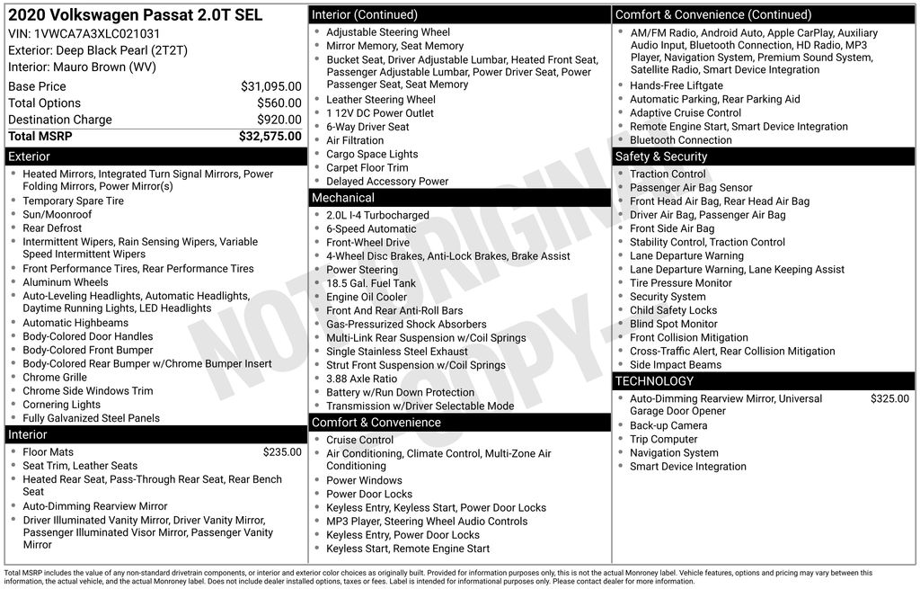 Recent Arrival! Mauro Brown Leather, 4-Wheel Disc Brakes, 9 Speakers, ABS brakes, Active Blind Spot Monitor, Air Conditioning, Alloy wheels, AM/FM radio: SiriusXM, Auto High-beam Headlights, Auto-dimming Rear-View mirror, Automatic temperature control, Brake assist, Bumpers: body-color, Delay-off headlights, Driver door bin, Driver vanity mirror, Dual front impact airbags, Dual front side impact airbags, Electronic Stability Control, Exterior Parking Camera Rear, Four wheel independent suspension, Frameless Auto-Dimming Rearview Mirror, Front anti-roll bar, Front Bucket Seats, Front Center Armrest, Front dual zone A/C, Front reading lights, Fully automatic headlights, Heated door mirrors, Heated Front Comfort Sport Seats, Heated front seats, Heated rear seats, Illuminated entry, Leather Shift Knob, Leather steering wheel, Low tire pressure warning, Memory seat, Monster Mats Rubber Mats Kit (Set of 4), Navigation System, Occupant sensing airbag, Outside temperature display, Overhead airbag, Overhead console, Panic alarm, Passenger door bin, Passenger vanity mirror, Perforated Vienna Leather Seating Surfaces, Power door mirrors, Power driver seat, Power moonroof, Power passenger seat, Power steering, Power windows, Radio data system, Radio: Discover Media w/Touchscreen Navigation, Rain sensing wipers, Rear anti-roll bar, Rear reading lights, Rear seat center armrest, Rear window defroster, Remote keyless entry, Security system, Speed control, Speed-sensing steering, Split folding rear seat, Steering wheel mounted audio controls, Tachometer, Telescoping steering wheel, Tilt steering wheel, Traction control, Trip computer, Turn signal indicator mirrors, Variably intermittent wipers, VW App-Connect (w/Apple CarPlay, Android Auto & MirrorLink), Wheels: 18" x 8J 5-Spoke 2-Tone Machined Alloy, Mauro Brown Leather.