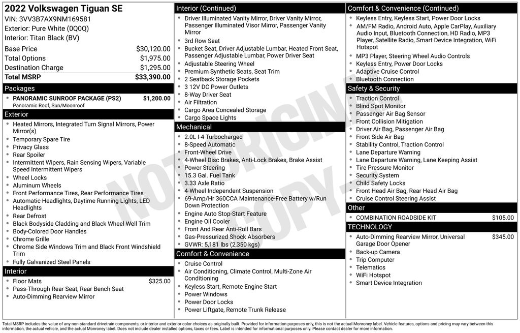 2022 Volkswagen Tiguan 2.0T SE Pure White 2.0T SE FWD 8-Speed Automatic with Tiptronic 2.0L TSI DOHC 3.33 Axle Ratio, 3rd row seats: bench, 4-Wheel Disc Brakes, 4-Wheel Independent Suspension, 6 Speakers, ABS brakes, Air Conditioning, Alloy wheels, AM/FM radio: SiriusXM with 360L, Auto-dimming Rear-View mirror, Automatic temperature control, Brake assist, Bumpers: body-color, Compass, Delay-off headlights, Driver door bin, Driver vanity mirror, Dual front impact airbags, Dual front side impact airbags, Electronic Stability Control, Emergency communication system: Car-Net, Exterior Parking Camera Rear, Four wheel independent suspension, Front anti-roll bar, Front Bucket Seats, Front Center Armrest, Front dual zone A/C, Front reading lights, Fully automatic headlights, Heated door mirrors, Heated Front Comfort Seats, Heated front seats, Illuminated entry, Leather Shift Knob, Low tire pressure warning, Occupant sensing airbag, Outside temperature display, Overhead airbag, Overhead console, Panic alarm, Passenger door bin, Passenger vanity mirror, Perforated V-Tex Leatherette Seating Surfaces, Power door mirrors, Power driver seat, Power Liftgate, Power steering, Power windows, Radio data system, Radio: MIB3 Composition Media AM/FM/HD, Rain sensing wipers, Rear anti-roll bar, Rear reading lights, Rear seat center armrest, Rear window defroster, Rear window wiper, Remote keyless entry, Roof rack: rails only, Security system, Speed control, Speed-sensing steering, Split folding rear seat, Spoiler, Steering wheel mounted audio controls, Tachometer, Telescoping steering wheel, Tilt steering wheel, Traction control, Trip computer, Turn signal indicator mirrors, Variably intermittent wipers, Wheels: 18" Dark Graphite 10-Spoke Alloy.