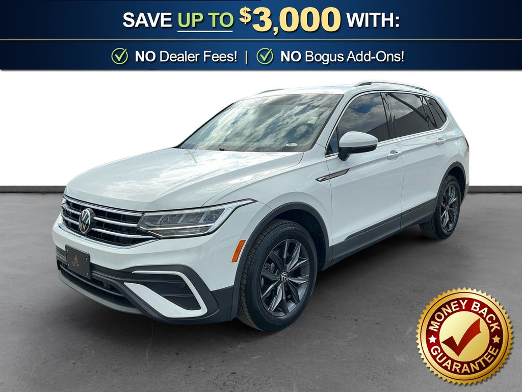 2022 Volkswagen Tiguan 2.0T SE Pure White 2.0T SE FWD 8-Speed Automatic with Tiptronic 2.0L TSI DOHC 3-Row Rubber Monster Mats w/Logo Kit (Set of 5), 3.33 Axle Ratio, 3rd row seats: bench, 4-Wheel Disc Brakes, 4-Wheel Independent Suspension, 6 Speakers, ABS brakes, Air Conditioning, Alloy wheels, AM/FM radio: SiriusXM with 360L, Auto-Dimming Rear-View Mirror, Auto-dimming Rear-View mirror, Automatic temperature control, Brake assist, Bumpers: body-color, Compass, Delay-off headlights, Driver door bin, Driver vanity mirror, Dual front impact airbags, Dual front side impact airbags, Electronic Stability Control, Emergency communication system: Car-Net, Exterior Parking Camera Rear, First Aid Kit, Four wheel independent suspension, Front anti-roll bar, Front Bucket Seats, Front Center Armrest, Front dual zone A/C, Front reading lights, Fully automatic headlights, Heated door mirrors, Heated Front Comfort Seats, Heated front seats, Heavy Duty Trunk Liner w/VW CarGo Blocks, Illuminated entry, Leather Shift Knob, Low tire pressure warning, Occupant sensing airbag, Outside temperature display, Overhead airbag, Overhead console, Panic alarm, Panoramic Sunroof Package, Passenger door bin, Passenger vanity mirror, Perforated V-Tex Leatherette Seating Surfaces, Power door mirrors, Power driver seat, Power Liftgate, Power steering, Power windows, Radio data system, Radio: MIB3 Composition Media AM/FM/HD, Rain sensing wipers, Rear anti-roll bar, Rear reading lights, Rear seat center armrest, Rear window defroster, Rear window wiper, Remote keyless entry, Roadside Assistance Kit, Roof rack: rails only, Security system, Speed control, Speed-sensing steering, Split folding rear seat, Spoiler, Steering wheel mounted audio controls, Tachometer, Telescoping steering wheel, Tilt steering wheel, Traction control, Trip computer, Turn signal indicator mirrors, Variably intermittent wipers, Wheels: 18" Dark Graphite 10-Spoke Alloy.