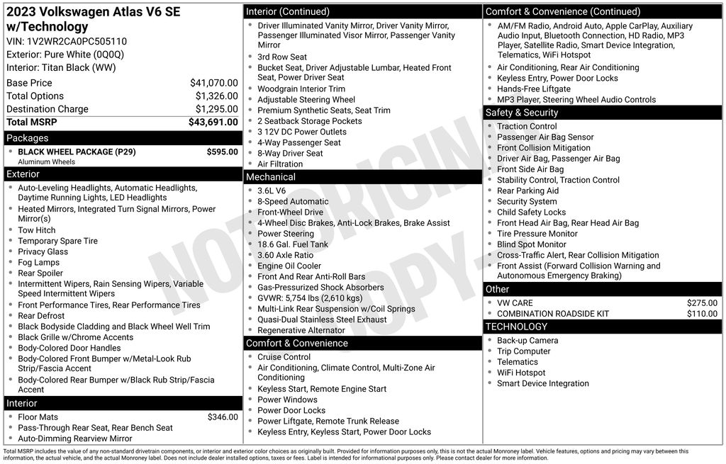2023 Volkswagen Atlas 3.6L V6 SE w/Technology Pure White 3.6L V6 SE w/Technology FWD 8-Speed Automatic with Tiptronic 3.6L VR6 3.60 Axle Ratio, 3rd row seats: split-bench, 4-Wheel Disc Brakes, 6 Speakers, ABS brakes, Air Conditioning, Alloy wheels, AM/FM radio: SiriusXM with 360L, Auto-dimming Rear-View mirror, Automatic temperature control, Brake assist, Bumpers: body-color, Compass, Delay-off headlights, Driver door bin, Driver vanity mirror, Dual front impact airbags, Dual front side impact airbags, Electronic Stability Control, Emergency communication system: VW Car-Net Safe & Secure 5-year, Exterior Parking Camera Rear, Four wheel independent suspension, Front anti-roll bar, Front Bucket Seats, Front Center Armrest, Front dual zone A/C, Front fog lights, Front reading lights, Fully automatic headlights, Heated Comfort Front Bucket Seats, Heated door mirrors, Heated front seats, Illuminated entry, Leather Shift Knob, Low tire pressure warning, Occupant sensing airbag, Outside temperature display, Overhead airbag, Overhead console, Panic alarm, Passenger door bin, Passenger vanity mirror, Perforated V-Tex Leatherette Seating Surfaces, Power door mirrors, Power driver seat, Power Liftgate, Power steering, Power windows, Radio data system, Radio: MIB3 Composition Media w/8" Touchscreen, Rain sensing wipers, Rear air conditioning, Rear anti-roll bar, Rear reading lights, Rear seat center armrest, Rear window defroster, Rear window wiper, Remote keyless entry, Security system, Speed control, Speed-sensing steering, Split folding rear seat, Spoiler, Standard Suspension, Steering wheel mounted audio controls, Tachometer, Telescoping steering wheel, Tilt steering wheel, Traction control, Trip computer, Turn signal indicator mirrors, Variably intermittent wipers, Wheels: 20" x 8J 5-Spoke Silver Painted Alloy.